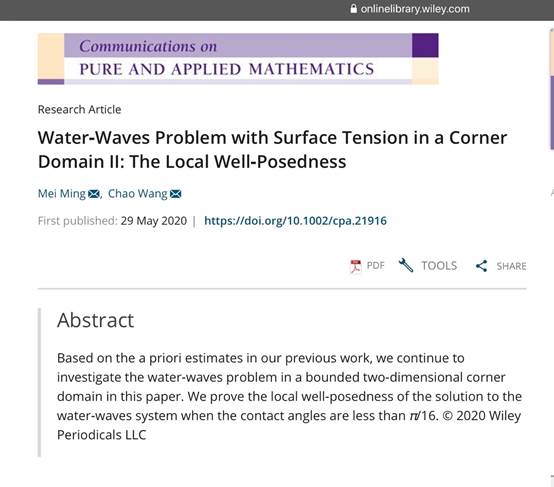 近日,威廉体育官方网站明梅副教授与合作者的论文“Water waves problem with surface tension in a corner domain II: the local well-posedness”在国际顶尖数学期刊Communications on Pure and Applied Mathematics(CPAM)上在线发表。CPAM由国际最负盛名的应用数学研究所之一—柯朗数学科学研究所(Courant Institute of Mathematical Sciences)于1948年创刊,发表纯粹与应用数学、数学物理等研究领域具有突破性的一流研究成果。该杂志每年刊载不到百篇论文,在数学界有极高的知名度和影响力,属于数学类最顶尖的期刊之一。例如,CPAM曾在2013年被ISI Journal Citation Reports评价为302种入选数学类刊物第一名。