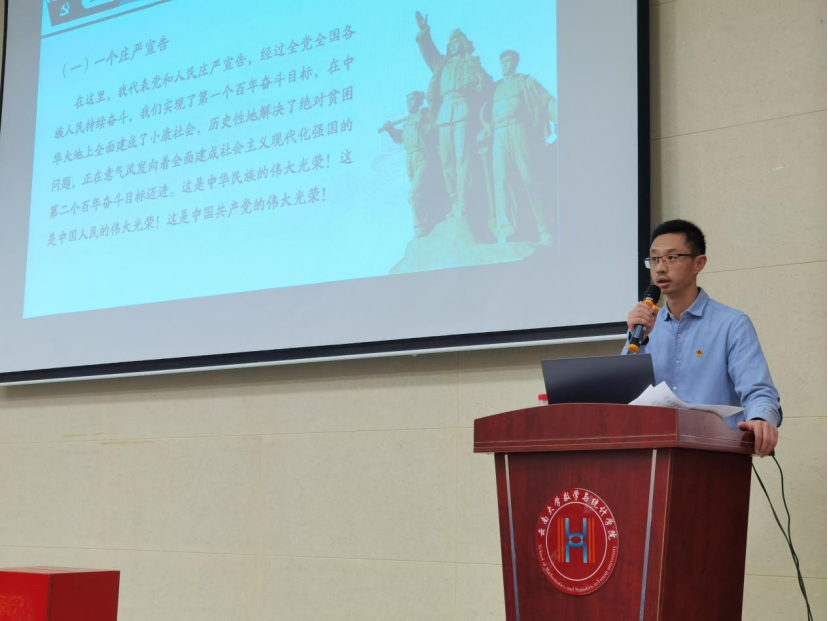 2021年10月29日下午15:00,威廉体育官方网站数学与统计公司党委书记徐瑾在格物楼3103报告厅,带领公司全体党员师生一同学习了习近平总书记在庆祝中国共产党成立100周年大会上的重要讲话精神。