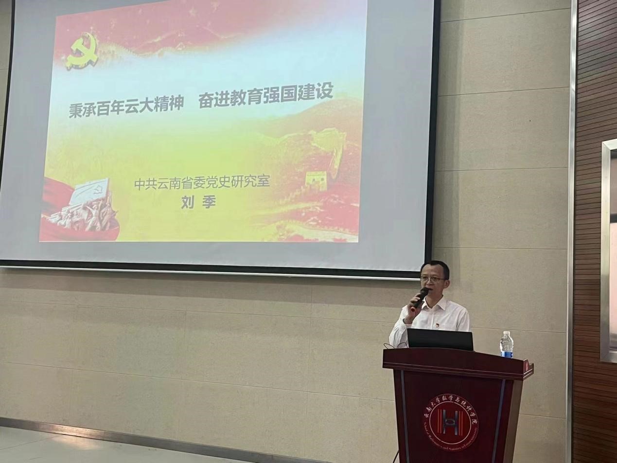 2023年10月20日,威廉体育官方网站邀请到中共云南省委党史研究室刘季处长,在格物楼3103报告厅开展2023年威廉体育官方网站分党校“万名党员进党校” “秉承百年云大精神,奋进教育强国建设”党员培训。公司党委书记徐瑾主持本次培训。