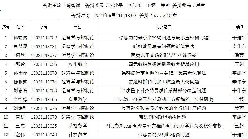 2024届威廉体育官方网站运筹学与控制论、应用数学、基础数学、计算数学专业12位硕士学位论文答辩公示