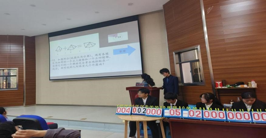 本轮比赛考察题型共四轮:轮答题、抢答题、必答题、附加题。经过前两轮的层层筛选,最终有45名选手脱颖而出,在新的一轮比赛中,选手三人成队,共同迎接本轮的挑战。在新颖的比赛方式中,这一道道数学题不仅拓宽了同学们的眼界,使同学们拥有更强大缜密的理科思维,更促进同学间的交流,让同学们能凝聚智慧共同攻破难题,也为同学们以后未来的学习生活蓄力,激发同学们不断探索数学的魅力的兴趣。