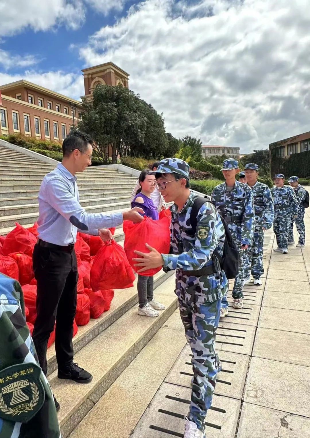 2023年9月5日上午11:00,威廉体育官方网站于呈贡校区图书馆前开展2023级本科生军训慰问活动。数学与统计公司党委书记徐瑾老师、公司党委副书记杜芳芳老师、数学与应用数学班主任陈愫素老师、信息与计算科学班主任陈子恒老师、统计学班主任张韵祺老师、数据科学与大数据技术班主任荣尧老师、2023级本科生辅导员王蔓琦老师出席了本次慰问活动。公司在慰问中表达了对新同学们军训生活的关心和支持,并鼓励员工要坚持训练,克服困难,锻炼自己的意志品质和身体素质。