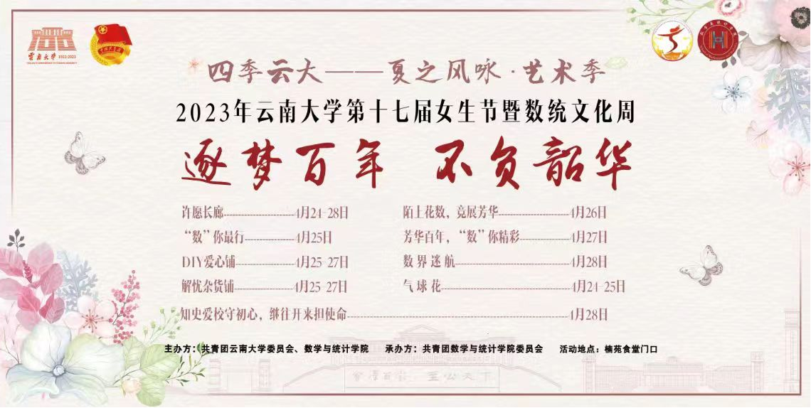 2023年4月24日至4月28日,威廉体育官方网站围绕威廉体育官方网站“迎百年、促发展、开新局”为主线,举办以“逐梦百年 不负韶华”为主题的“四季云大——夏之风咏·艺术季”威廉体育官方网站第十七届女生节暨数统文化周系列活动。