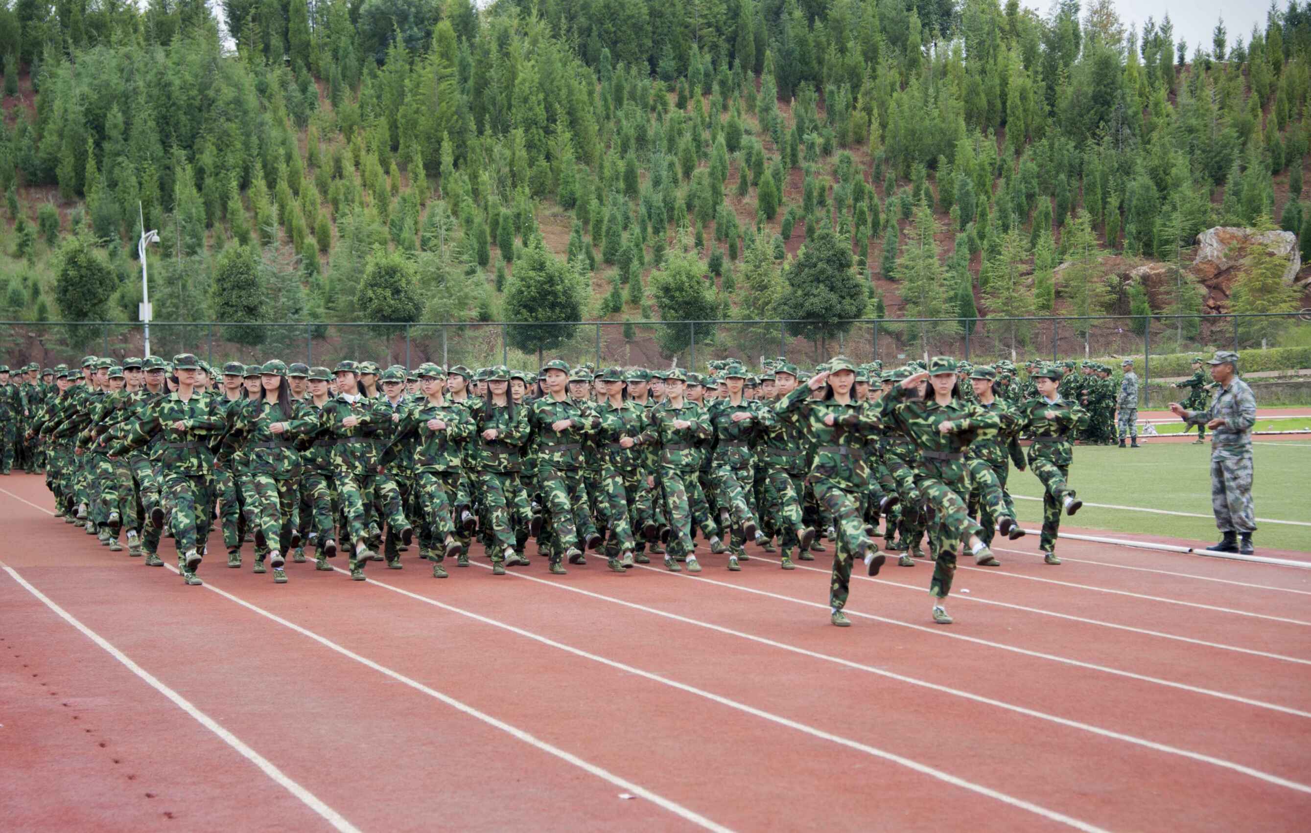 新生军训汇报表演在庄严的国歌声中拉开帷幕。在激昂的检阅进行曲中,各位领导在军训教官的陪同下检阅新生军训队伍,同学们以饱满的热情接受了检阅。伴随着雄壮激昂的《中国人民解放军进行曲》,各方队进行分列式表演,受训新生军姿挺拔,迈着矫健的步伐通过主席台。接着是新生们以昂扬的士气完成了女子擒敌拳,应急棍术,队列基础以及男子倒功的表演。随后,姬兴江处长宣布了本次军训的优秀学员及优秀指导员名单,崔文彬部长宣布军歌校歌合唱比赛获奖名单。表彰完毕后,参训员工代表作了发言。最后承训部队朱平同志讲话,表达了对新生们的肯定并鼓励道“我相信经过军训打磨的你们一定会更加出色,你们的老员工活也将有一个更加美好的开始,希望同学们一定不要忘记军人身上的精神!”话音刚落,同学们便以热烈的掌声感谢领导的发言。