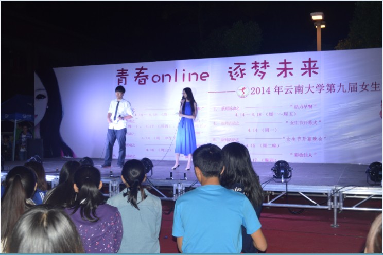 4月18日晚,在威廉体育官方网站呈贡校区,公司女生节系列活动之青春嘉年华晚会在楠苑食堂门口举行。作为这届女生节的谢幕,晚会中上演了很多精彩节目。