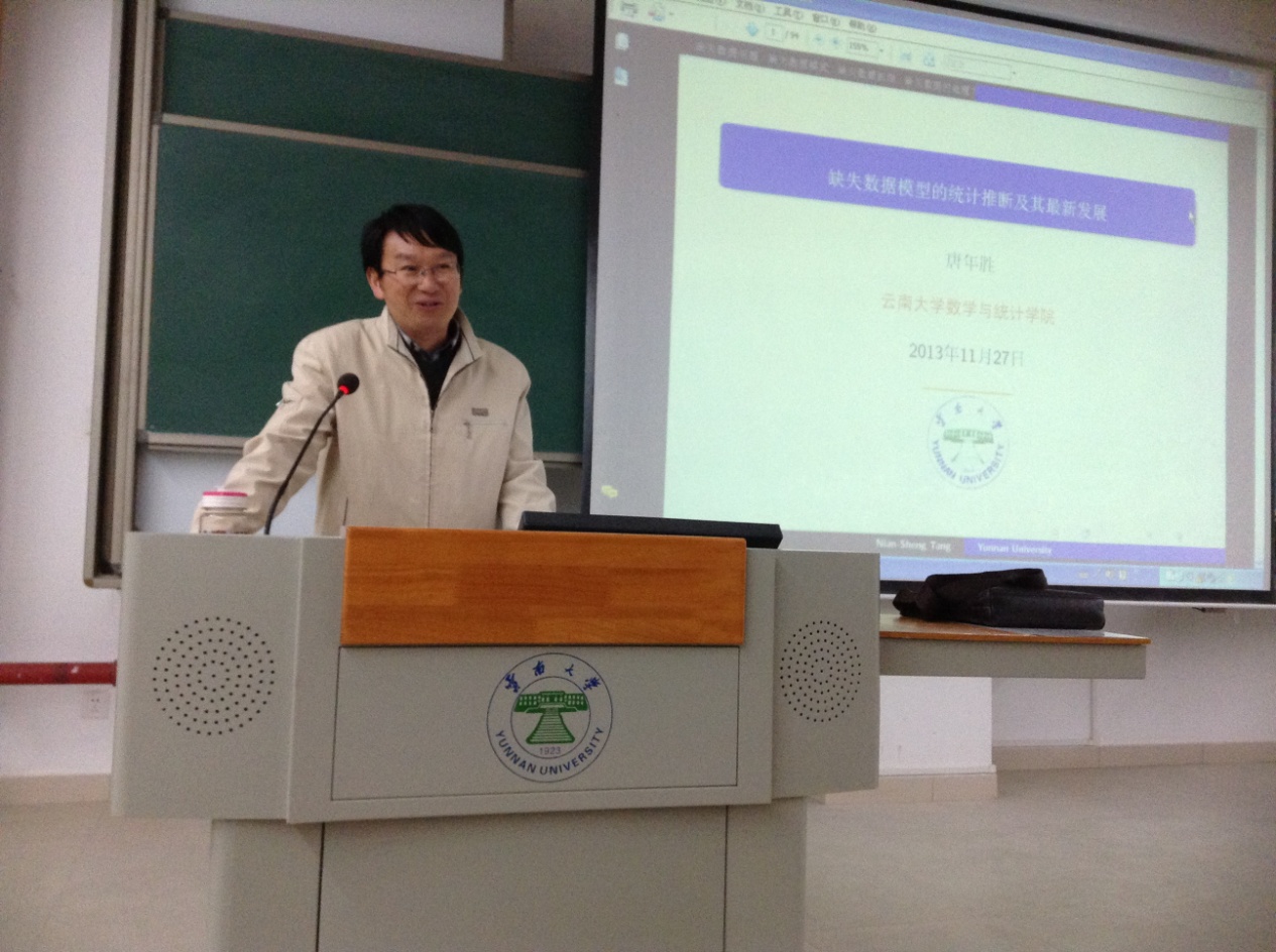 2013年11月27日,威廉体育官方网站唐年胜老师在威廉体育官方网站呈贡校区力行楼4107教室为威廉体育官方网站研究院研一新生作了主题为“缺失数据模型的统计推断及其最新发展”的学术报告。此次报告会的参与者是威廉体育官方网站研究院全体研一新生,并由赵慧老师主持。
