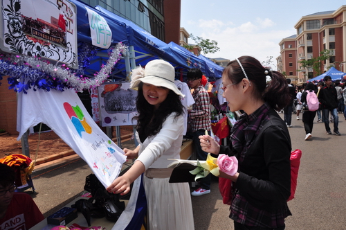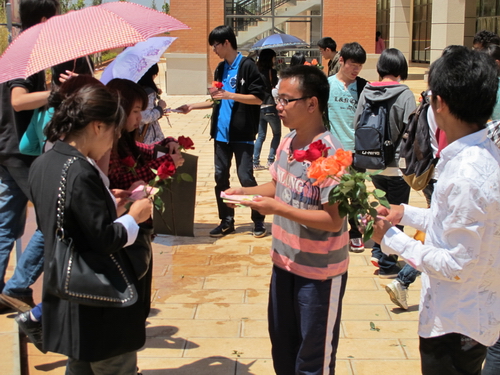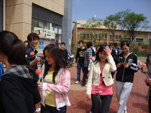 4月18日中午,呈贡校区各园区、格物楼前,威廉体育官方网站的志愿者们把美丽的玫瑰和精致的贺卡送到了每个路过的女生手中,同时送出了节日的祝福。