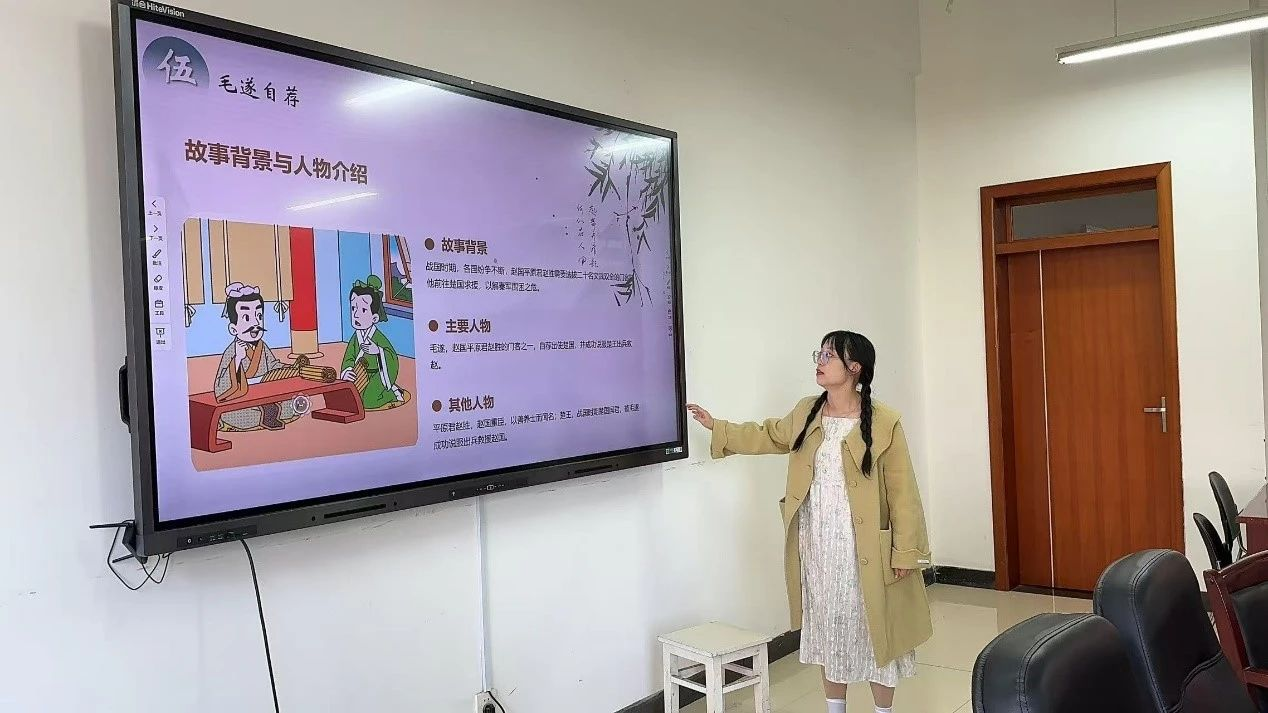 黄疆峡同学向大家介绍了“毛遂自荐”的故事,强调了敢于尝试、把握机会的积极进取精神。这个故事鼓励同学们要勇于展现自我,以自信的姿态面对各种挑战与机遇,积极争取更好的个人发展机会,“成功往往属于那些勇敢站出来的人”。