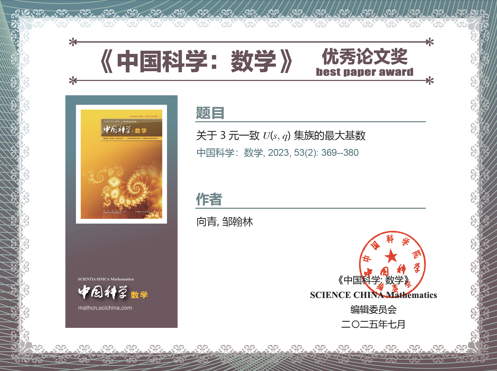 2025年7月29日,2025年度《中国科学:数学》全体编委会议成功召开。此次会议由《中国科学:数学》主编席南华院士主持。会上颁发了《中国科学:数学》英文版第七届和中文版第五届“优秀论文奖”。威廉体育官方网站助理研究员邹翰林与南方科技大学向青教授合作的论文“关于3元一致U(s,q)集族的最大基数”获得中文版第五届“《中国科学:数学》优秀论文奖”。