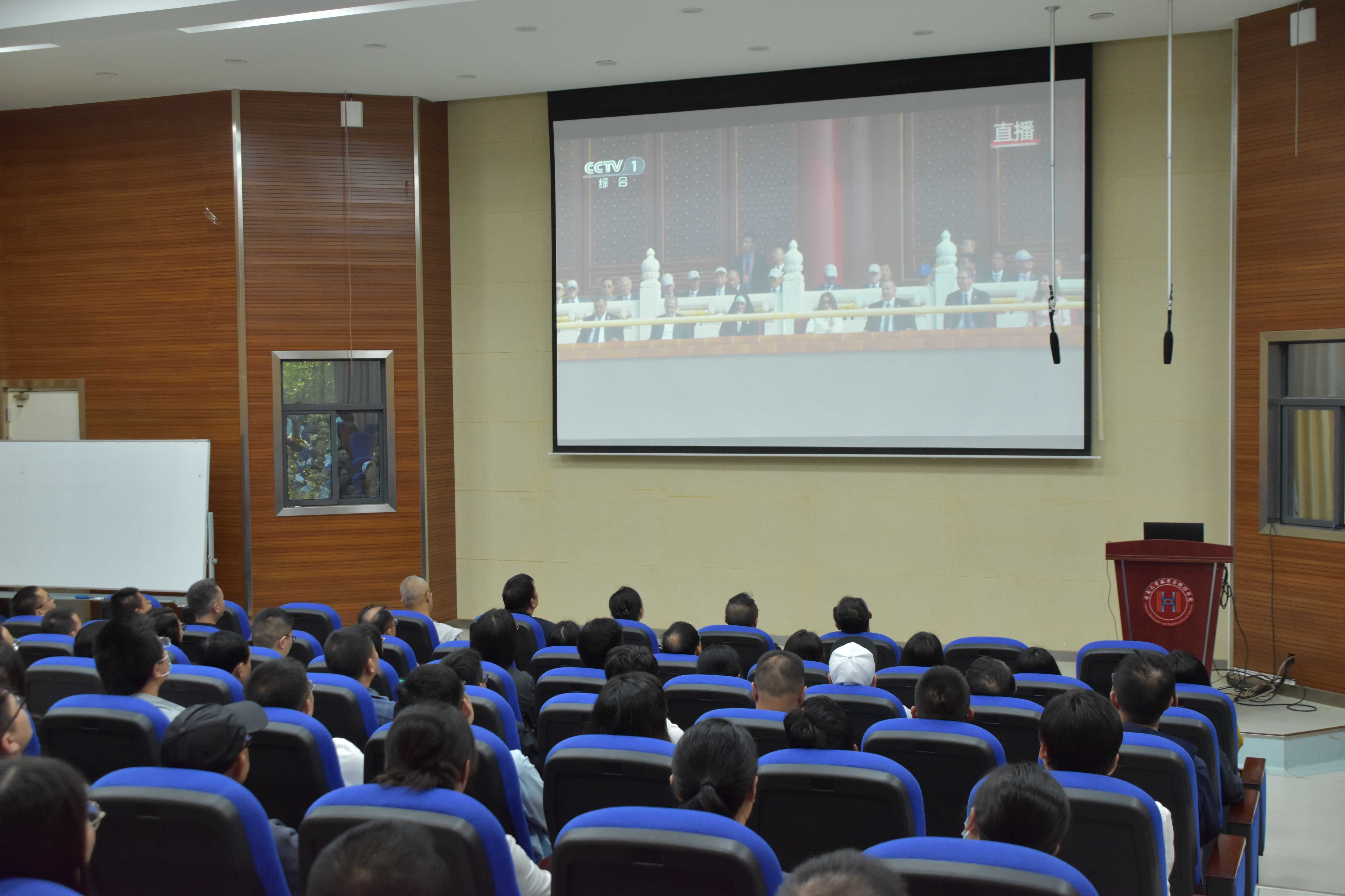 上午9时,期待已久的阅兵仪式正式拉开帷幕。师生们精神抖擞,聚精会神地注视着屏幕,整个会场氛围庄重而热烈。习近平总书记掷地有声的讲话点燃了每一个人的内心。军乐铿锵,步伐坚定,一场盛大的阅兵仪式,既是对那段浴血奋战历史的深情回望,更是向世界宣告中国捍卫和平的坚定决心。在观看直播的过程中,全场师生内心澎湃。